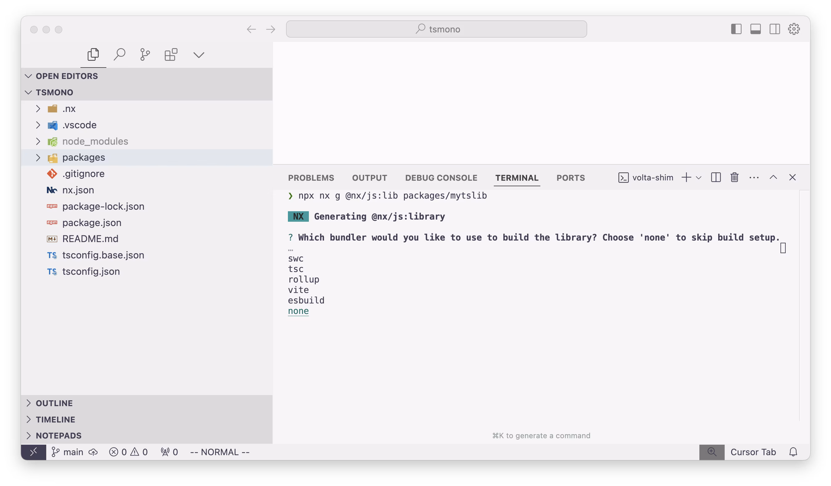 Let's start with a simple workspace setup without any framework or specific tech stack, just TypeScript support. This allows us to highlight how features can be incrementally added over time. Run the following command: